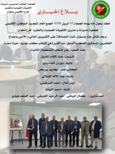 ويأتي انتخاب هذا المكتب الجديد في سياق التطلع إلى ضخ دماء جديدة في هياكل الجمعية، ومواصلة الدفاع عن القضايا المهنية لمديرات ومديري المؤسسات التعليمية، إضافة إلى الإسهام في تطوير المنظومة التربوية على الصعيد الإقليمي، وتعزيز أدوار الإدارة التربوية داخل المدرسة العمومية.